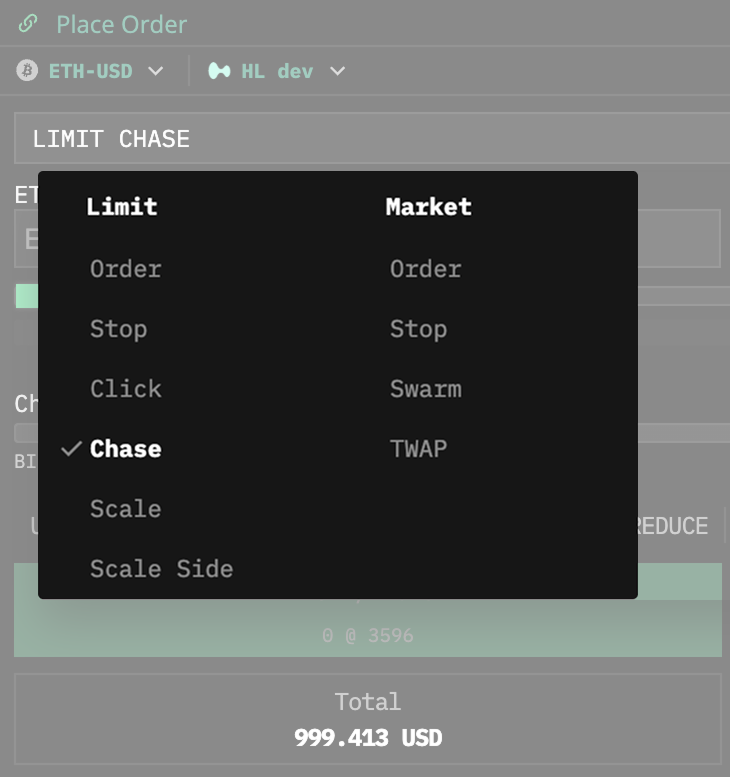 Use advanced order types like Chase, Swarm, TWAP and Scale.